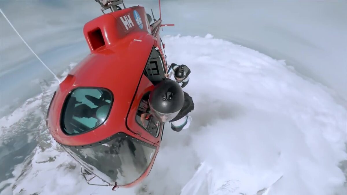 Wingsuiter met ballen van staal springt uit een vliegende helikopter