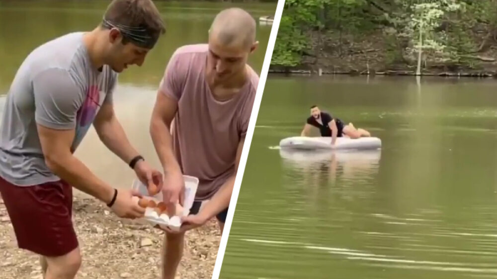 Een kameraad op grote afstand aan het chillen op een luchtbed? Geen probleem, ei op zijn bakkes. PETS!