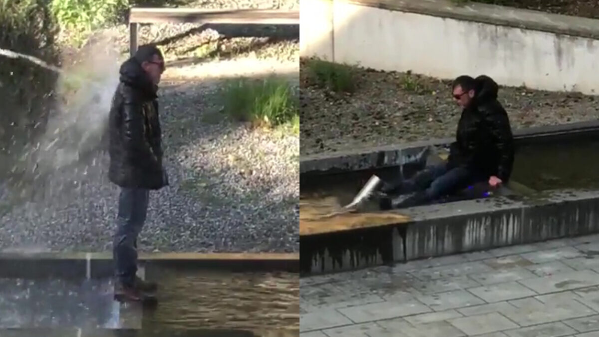 Dronken Duitser vermaakt zich optimaal in een vijver met fontein