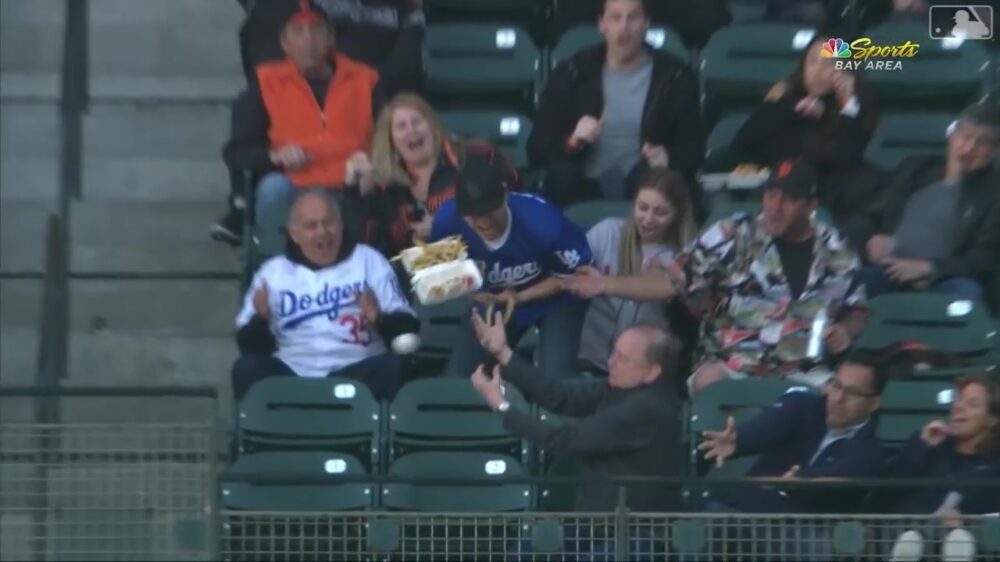 Zit je net lekker aan een vette bak patat (nee Blije, geen friet, doe eens normaal), komt er een honkbal op je af. Wat doe je dan, als rechtgeaarde honkbalfan? Precies, aan de kant met dat voer en pakken dat ding!