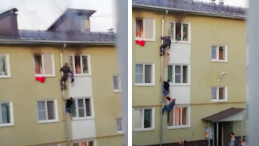 Heldhaftige Russen weten via een regenpijp kinderen te redden van brand
