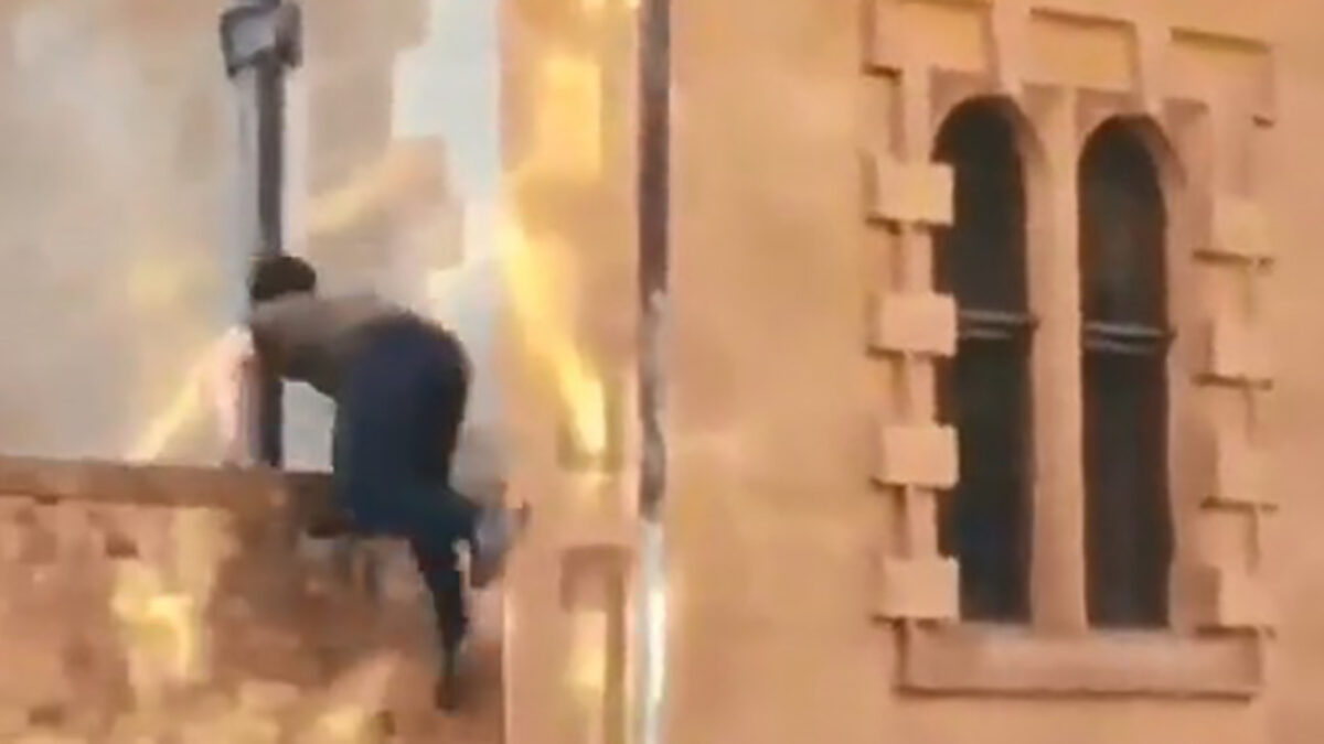 Parkourpro klimt op zijn dooie gemakje tegen een gebouw op