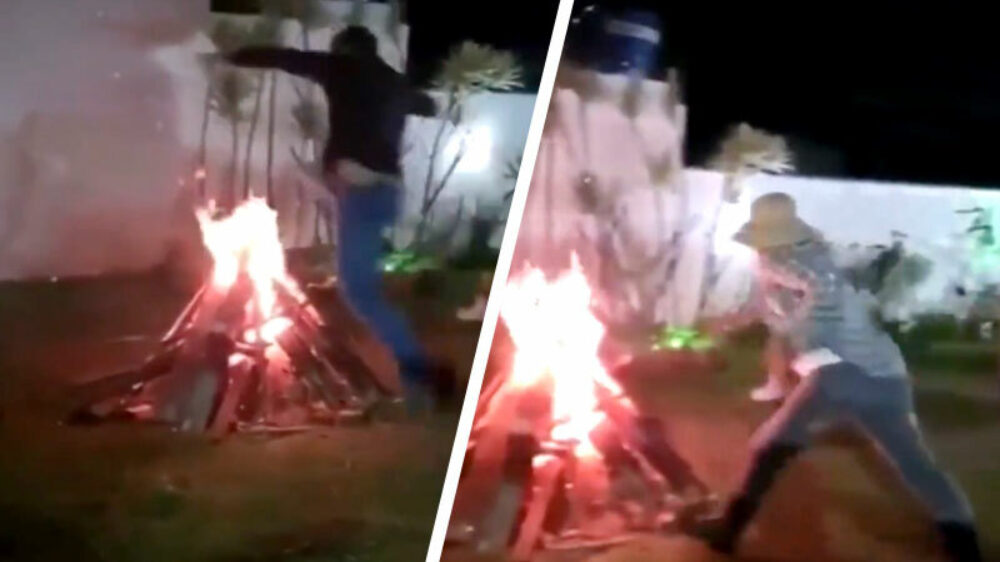 Zatlap wordt geroosterd als hij over een kampvuur probeert te springen