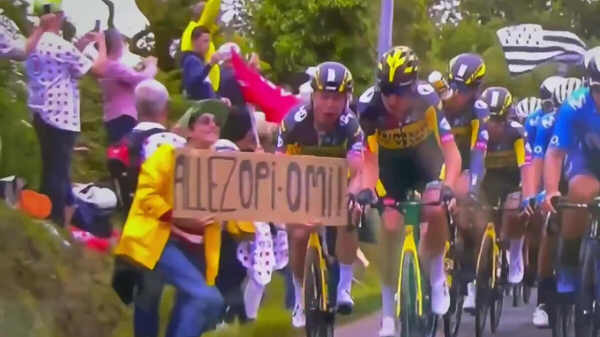 Massale valpartij in Tour de France dankzij vrouw met kartonnen bord