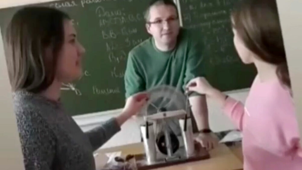 Vandaag staat er een experiment met een elektrofoormachine op de agenda. Olga en Tatjana, komen jullie maar eens even naar voren!