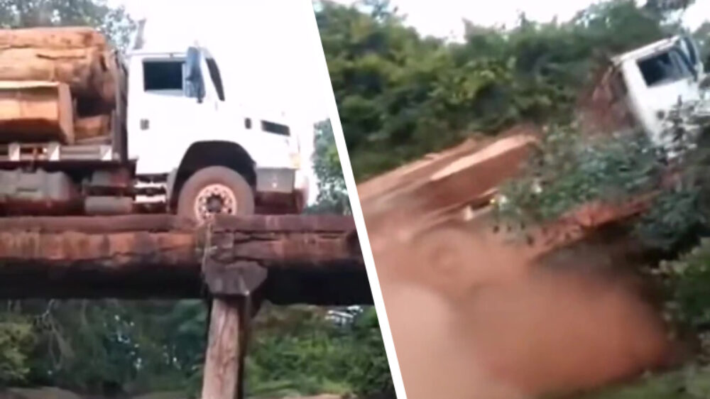 Met een vrachtwagen vol hout over een houten brug blijkt geen succes