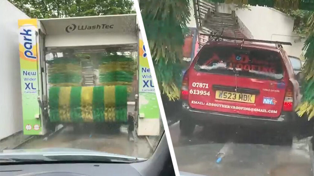 Gelukkig zagen de twee lachvogels het tafereel net op tijd en konden ze de automobilist waarschuwen voordat hij de hele wasstraat sloopt hun telefoon tevoorschijn halen om alles vast te leggen.