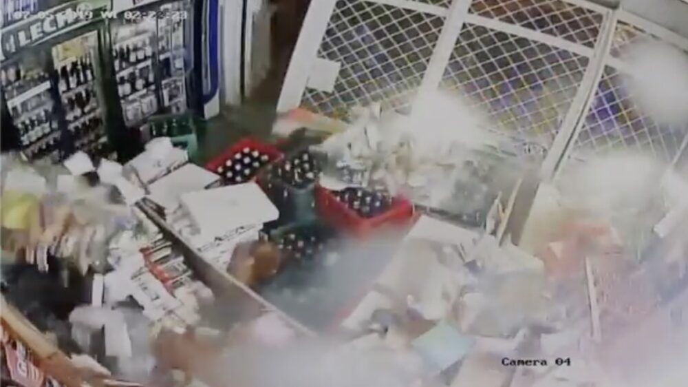 Bezopen Poolse troela ramt winkel om een flesje wodka te scoren