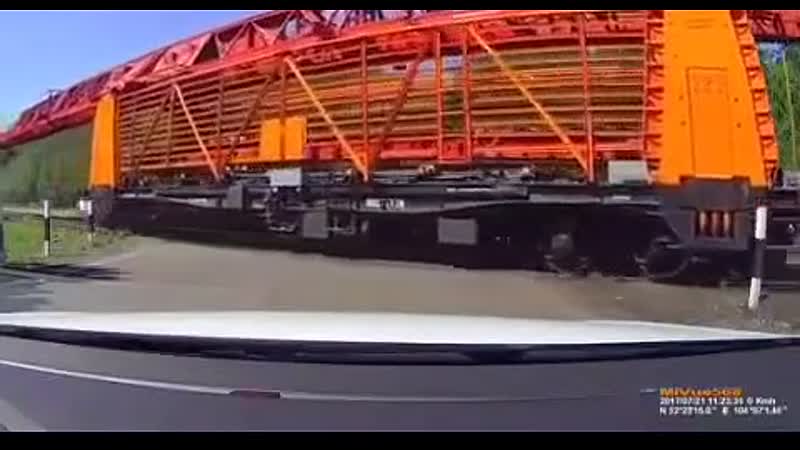 Toch wel handig dat je je herinnert dat je een bulldozer achterop hebt staan. Zeker als je vlak achter een trein langs wil rijden.
