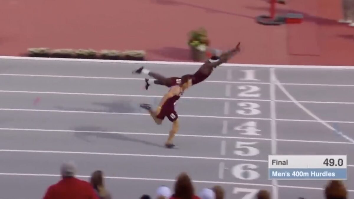 Nou is hordelopen per definitie een onderdeel voor eindbazen, maar na 400 meter zijn ook deze mannen gesloopt. Als je dan toch als eerste over de finish wil komen dan zit er maar één ding op: een Robin van Persietje doen.
