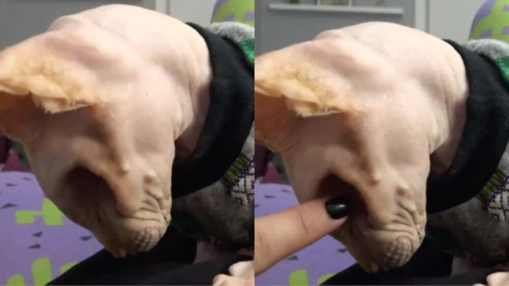 Bazinnetje helpt kale poes met krabben op bizarre plek