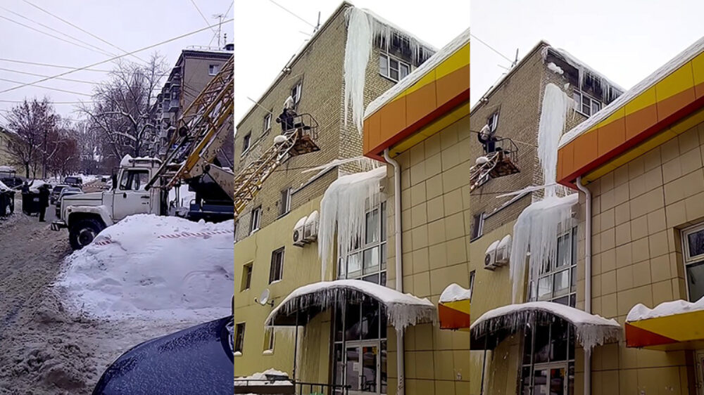 Russische werknemers verwijderen tactisch een ijspegel van het dak Fails