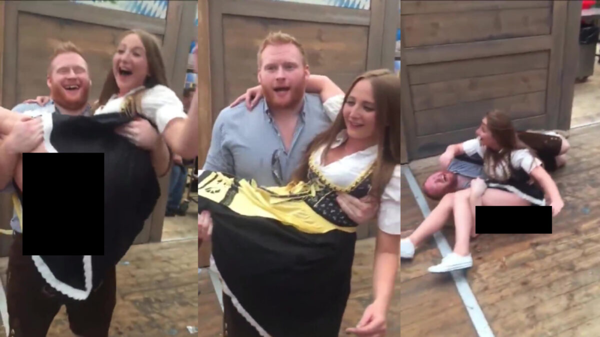 Oktoberfester würft zijn frau in die luft en geeft keurige blik op haar Muschi Fails