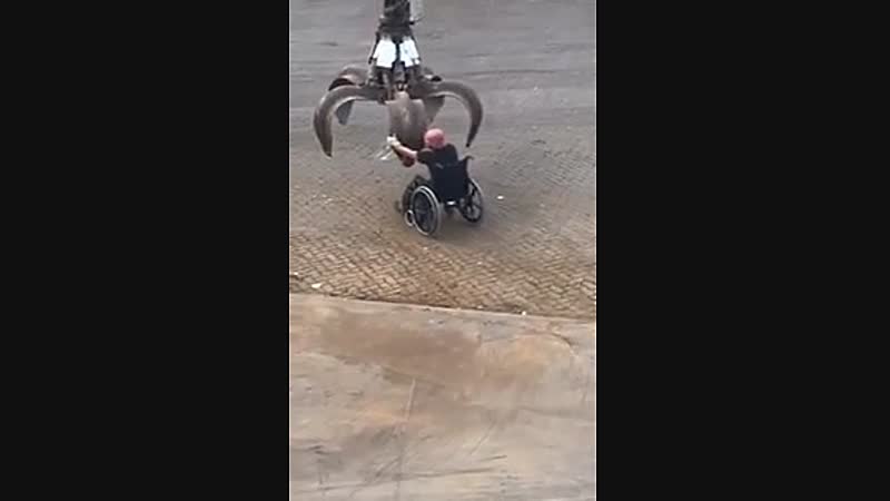 Rolstoeler wordt door hijskraan bij het oud ijzer gezet Fun