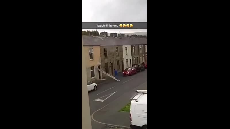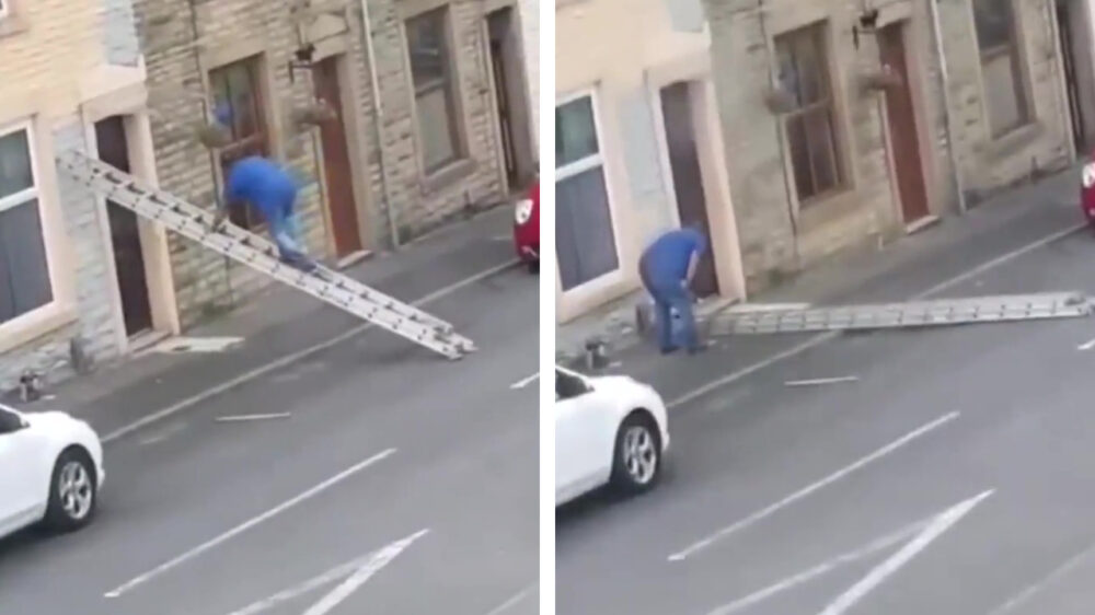 Je zou zeggen dat een ladder niet héél ingewikkeld is in gebruik, maar deze Engelse prutser weet tijdens het verven toch niet helemaal hoe zo'n gevaarte functioneert.