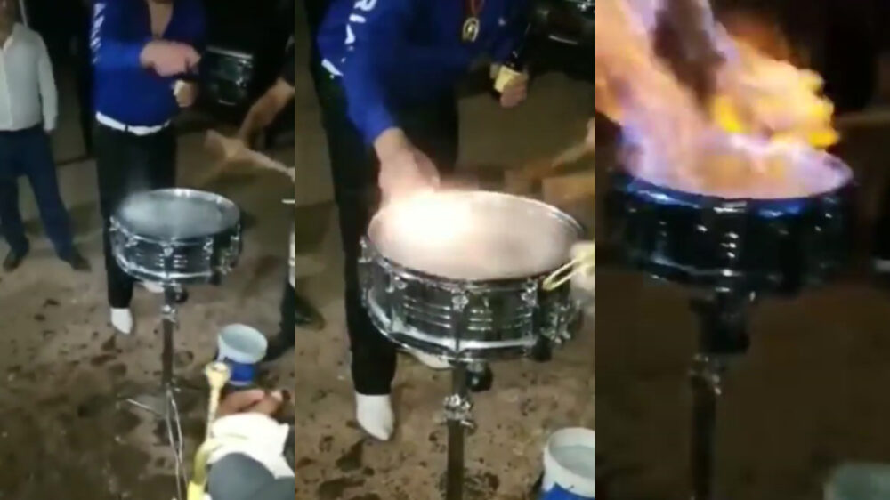 Met een beetje benzine op je snare geef je zo een vlammende drumsolo weg