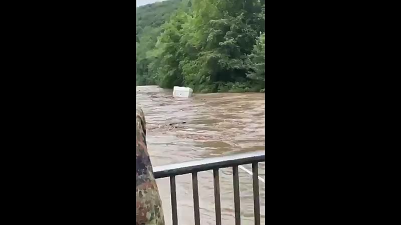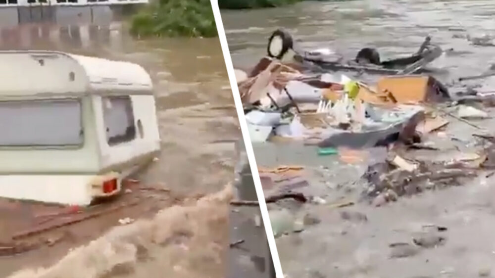 Caravan in stukjes gemaald door kolkende watermassa in Solingen, Duitsland
