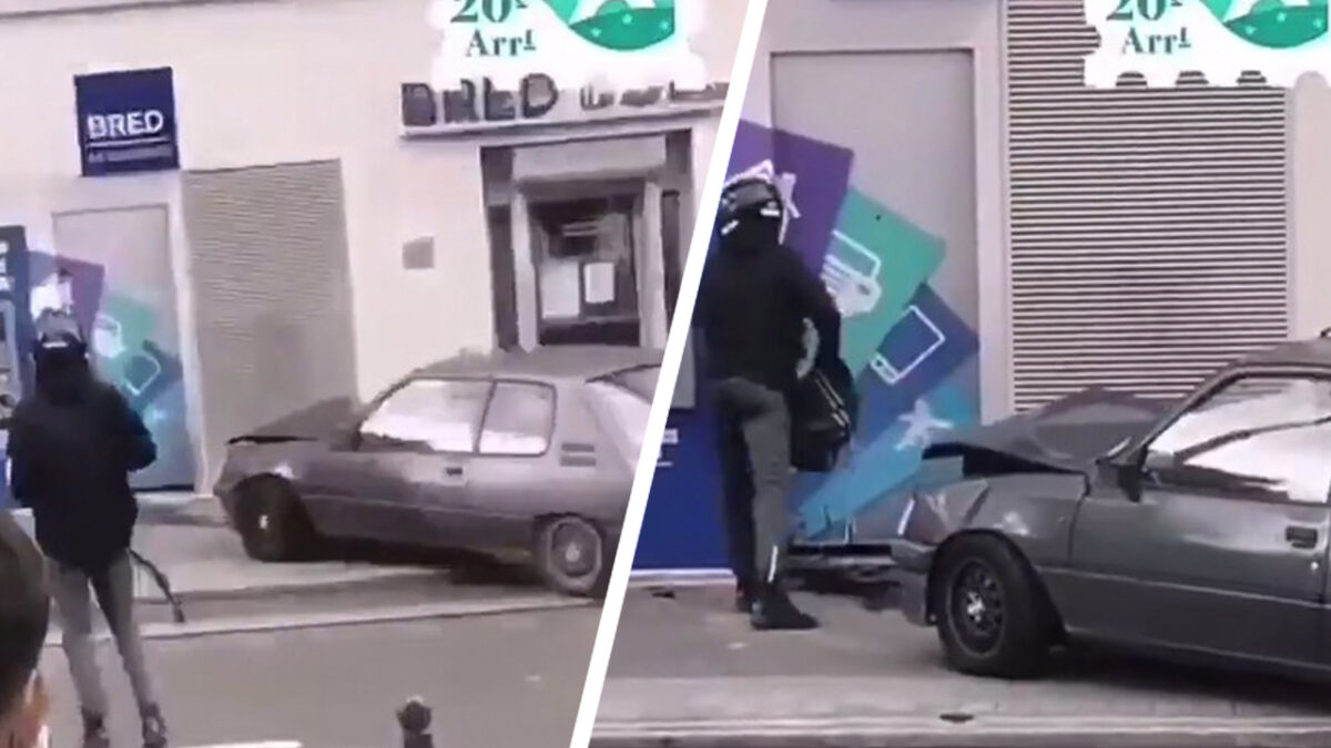 Twee Franse uitblinkers proberen een geldautomaat te rammen met een koekblik 205, maar de Peugeot houdt het al vrij snel voor gezien. Vooral dat trapje tegen de deur heeft nut. Putain!