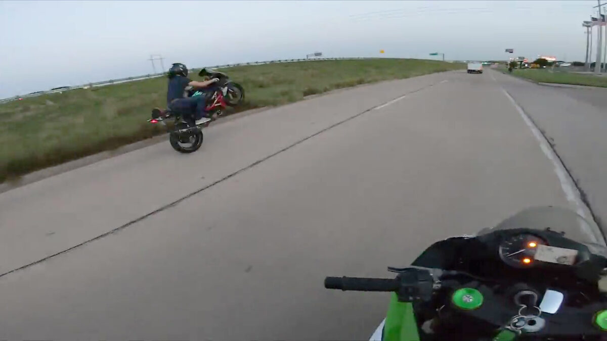Een #wheelie maken midden op de snelweg, tsjah, dat getuigt al niet van héél veel verkeersinzicht. Echter raakte deze motorrijder ook nog eens in paniek en trok 'ie aan zijn rem, waarna hij redelijk stevig op het asfalt belandde. Slechte dag om een t-shirtje te dragen, vriend.