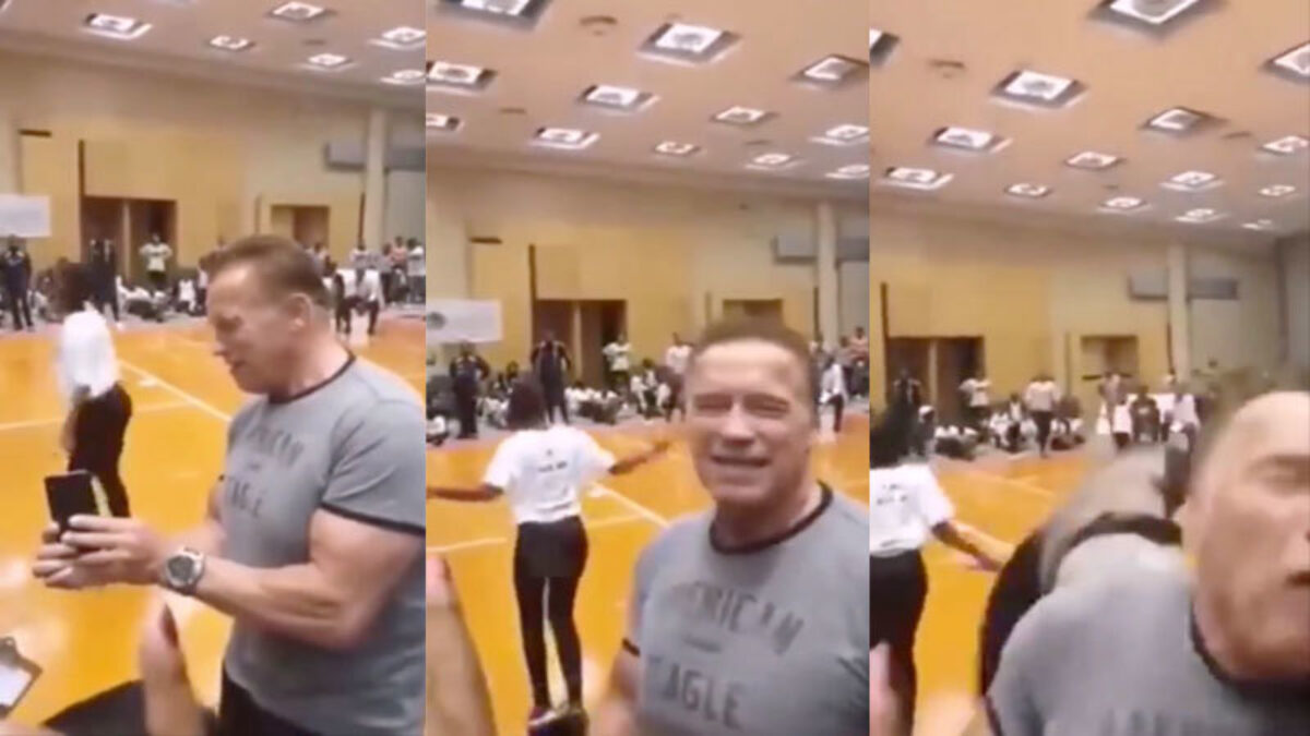 Arnold Schwarzenegger in zijn rug aangevallen met een laffe dropkick Bizar