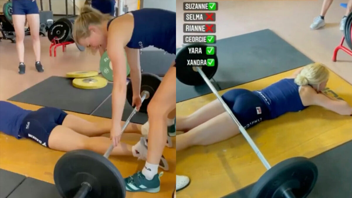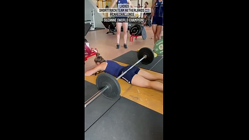 Het Nederlands shorttrackteam probeert de zogenaamde 'cake challenge'