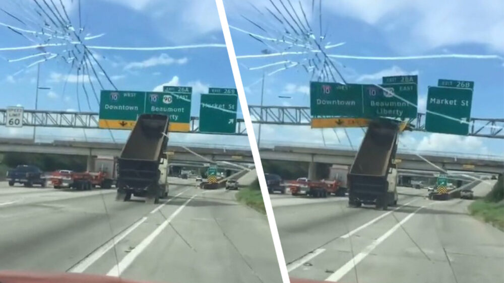 Vrachtwagenchauffeur vergeet ff dat zijn laadbak nog omhoog staat