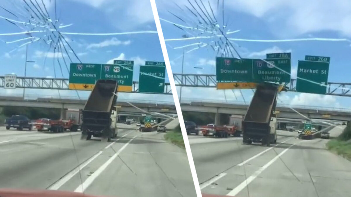 Vrachtwagenchauffeur vergeet ff dat zijn laadbak nog omhoog staat Fails