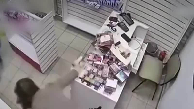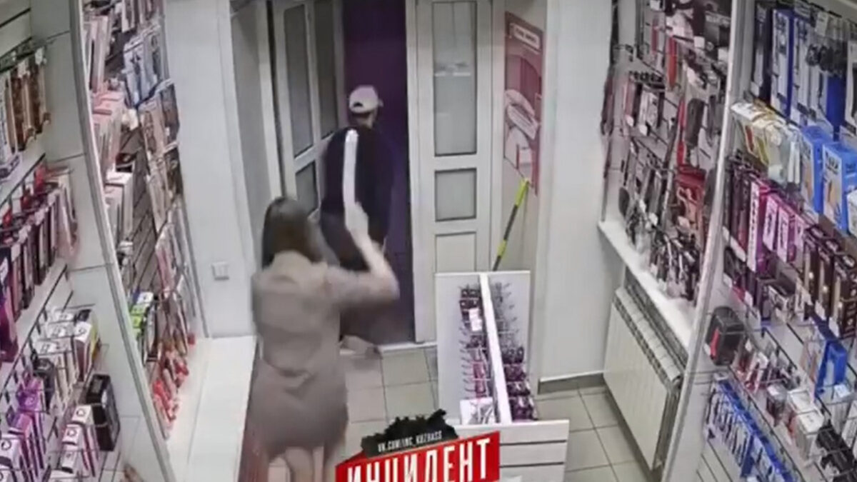 CCTV: Russische overvaller wordt met enorm apparaat de winkel uit gemept