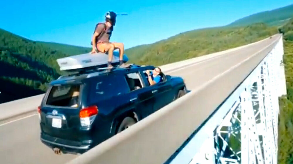 Leipo springt van rijdende auto en basejumpt zo de brug af