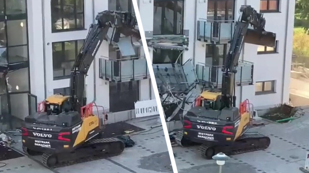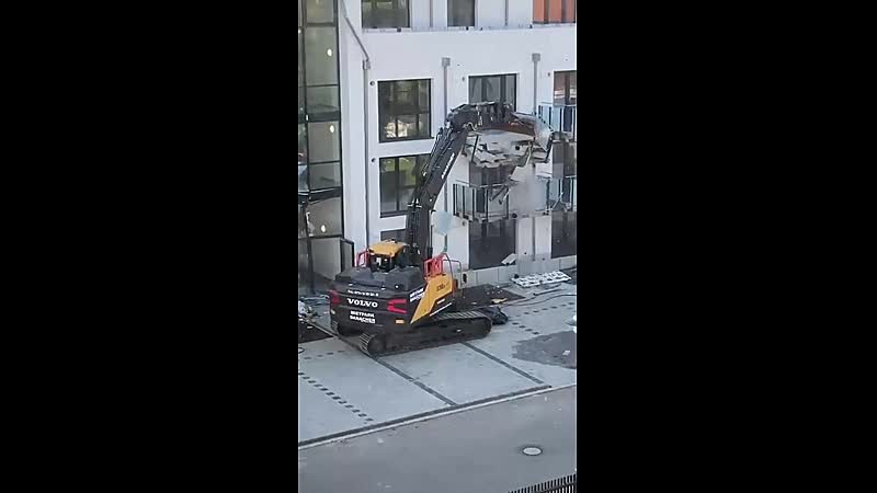 Waar zich dit precies in Duitsland afspeelt weten we niet, maar volgens bronnen zou er op de kraan een aannemer zitten die nog vijf miljoen van de projectontwikkelaar krijgt. Duurde hem te lang, dus slopen die handel! Naar verluidt stopte hij uiteindelijk alleen omdat er een hydraulische leiding knapte, anders kon de schade nog wel eens veel groter zijn geweest...