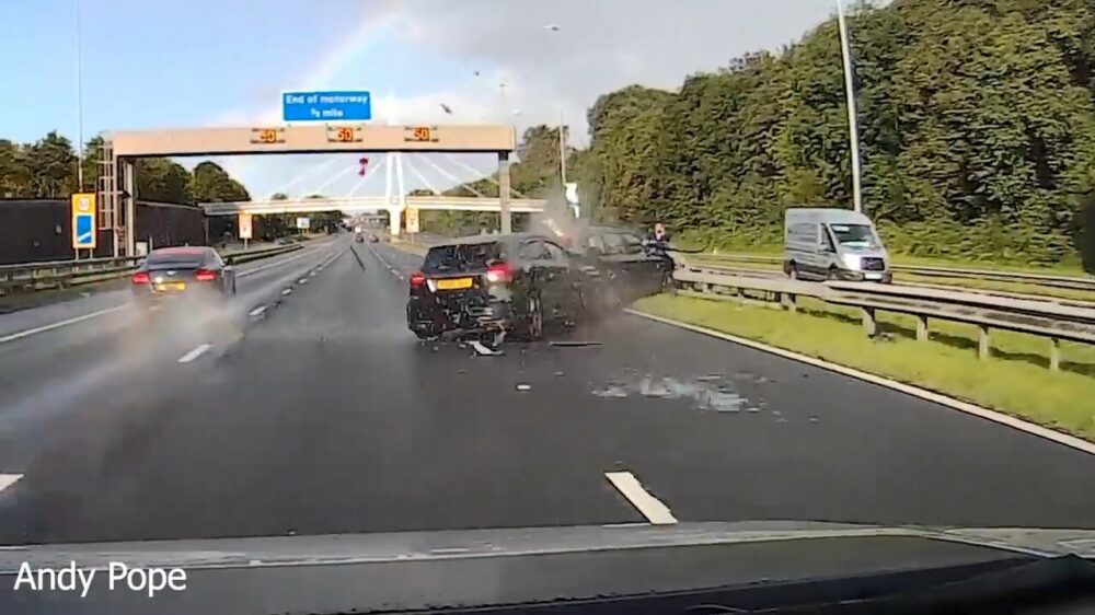 Met een snelheid van meer dan 90 km/u een 'geparkeerde' auto over het hoofd zien is natuurlijk nooit prettig. In Engeland doen ze schijnbaar niet meer aan een gevarendriehoek.