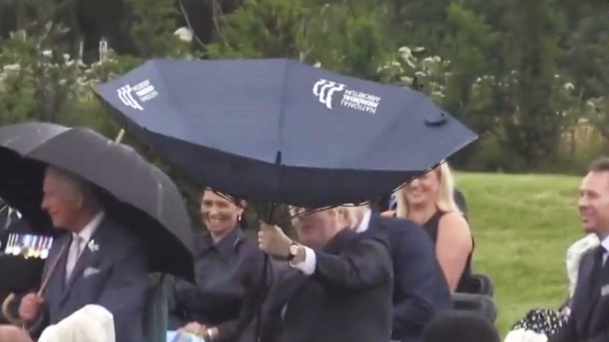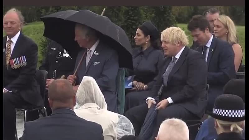 Tijdens een bloedserieuze herdenking in Staffordshire, Engeland was er gelukkig toch nog één vrolijke noot: premier Boris Johnson en zijn paraplu.