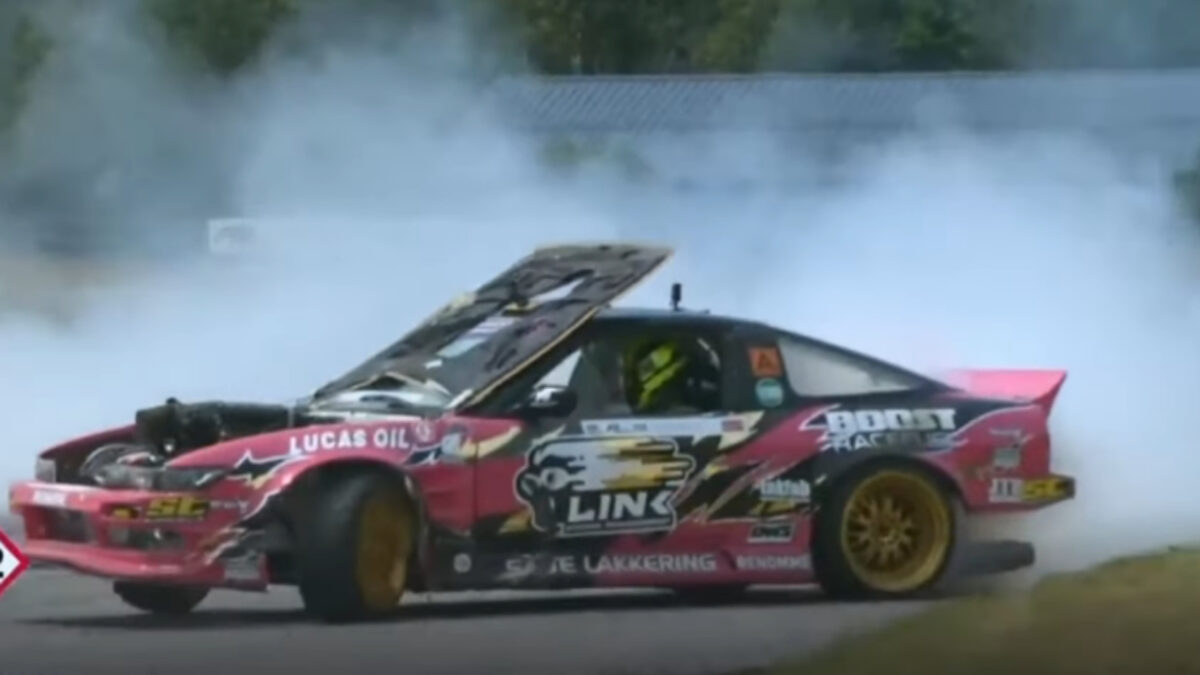Tor Arne Kvia was een deelnemer aan de European Drift Masters, maar na een paar meter in zijn run klapte zijn motorkap op zijn voorruit. Compleet blind dus, einde verhaal zou je zeggen, maar niets is minder waar: gas erop en gaan met die banaan!