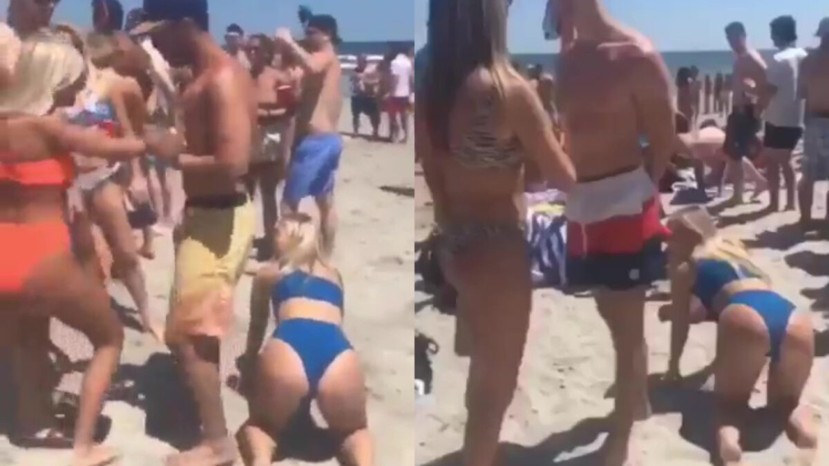 Ouder dan de moeder van massie: even op handen en voeten achter iemand gaan zitten en dan iemand anders laten duwen. Niet echt van hoog niveau, maar de bikini's maken een hoop goed.