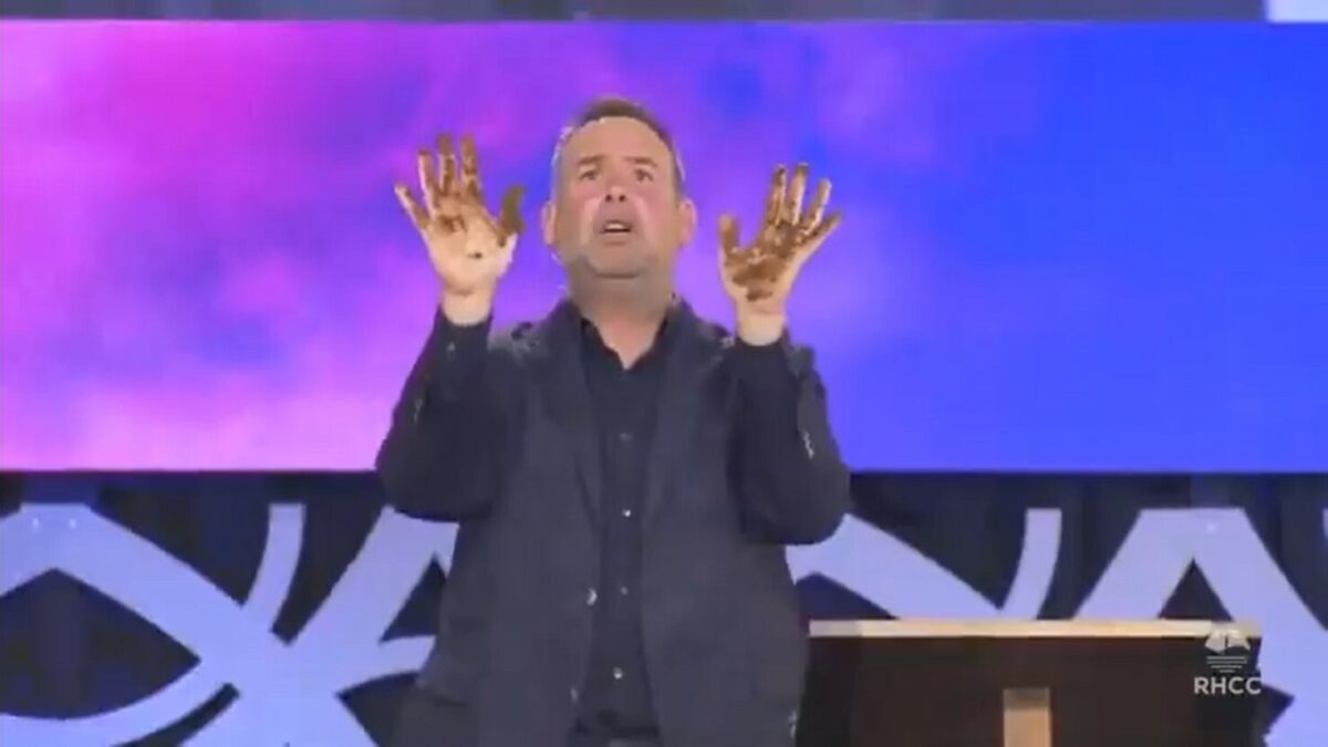 Pastoor Dan Burgoyne heeft een interessante manier gevonden om de boodschap van Jezus te delen en bedekt zijn handen met kaka om één of ander punt te maken over zonden. Koekoek!