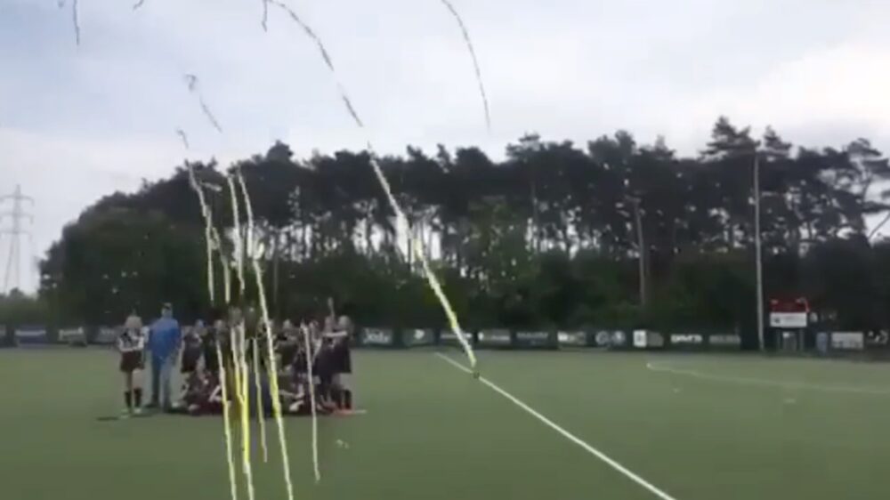 Belgisch hockeyteam viert kampioenschap door onder hoogspanningskabels slingers de lucht in te schieten