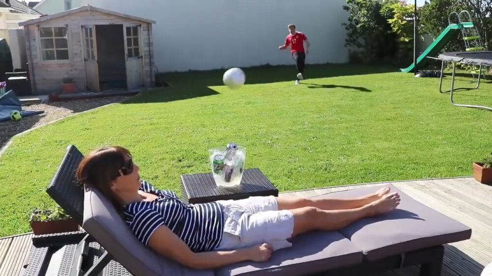 Kerel schiet met een voetbal zijn moeder vol op d'r blije bakkes