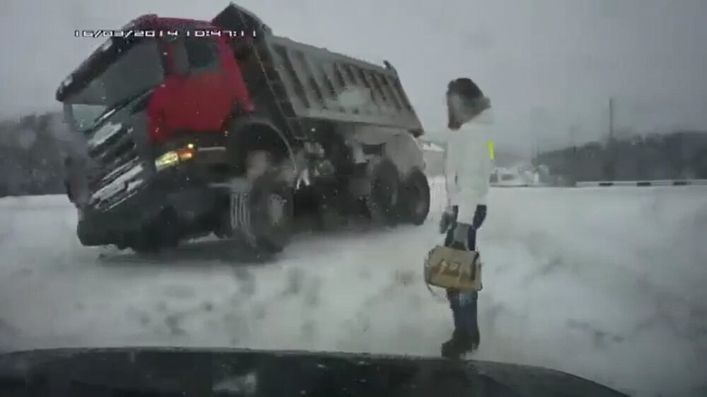 Vrachtwagenchauffeur zwaar onder de indruk van overstekende Russin Fails