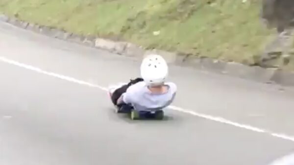 Longboarder vlamt naar beneden en wordt gelanceerd na verraderlijk bochtje