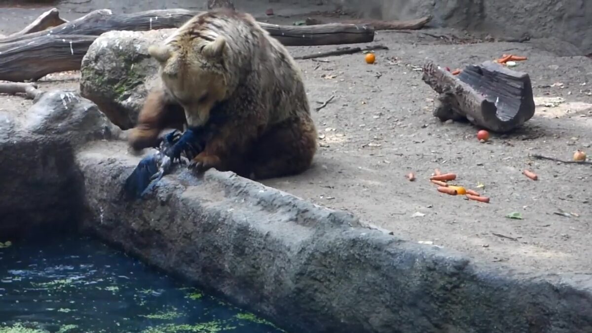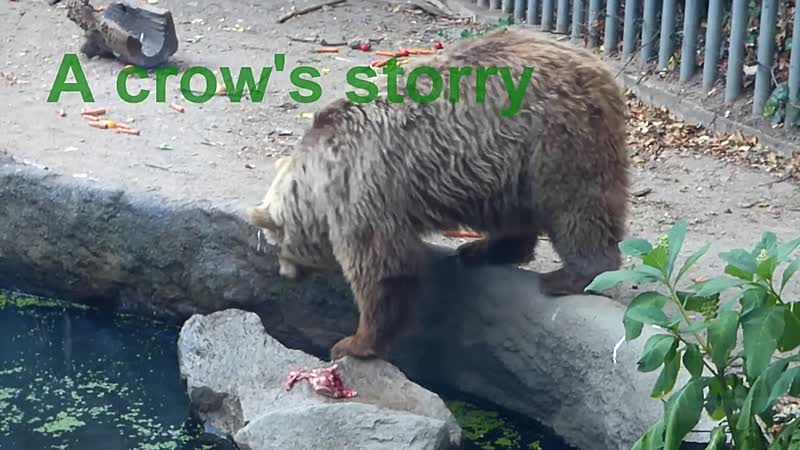 Je zou eigenlijk verwachten dat de enorme beer twee happen neemt en de kraai verscheurt, maar niets is minder waar. Uit de oude berendoos.