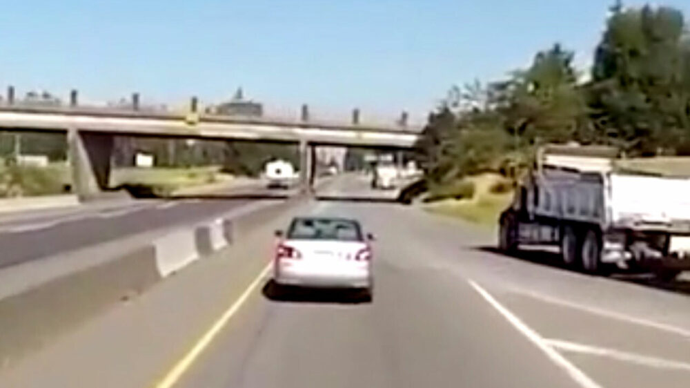 Prutser gaat meteen op de rem voor een invoegende vrachtwagen