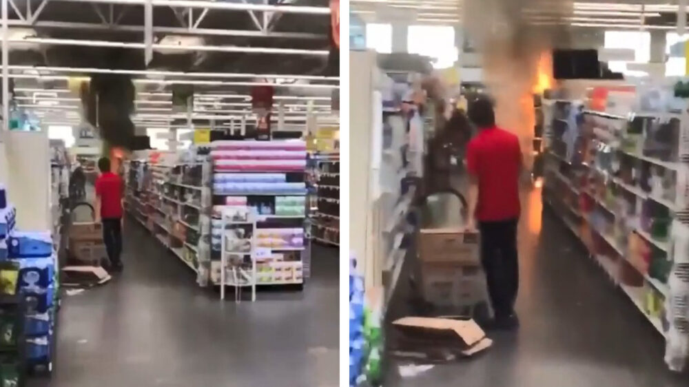 Een medewerker van een supermarkt in Minnesota ziet hoe k*tkoters vuurwerk in de winkel afsteken en hij grijpt onmiddellijk in... Oh nee, toch niet. Snel effe een fotootje maken.