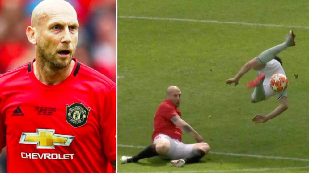 Jaap Stam laat tijdens benefietwedstrijd van Manchester United zien dat hij nog steeds een killer is!