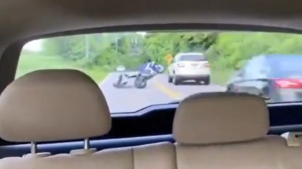 Motor klapt vol op een auto als deze idioot een wheelie wil maken
