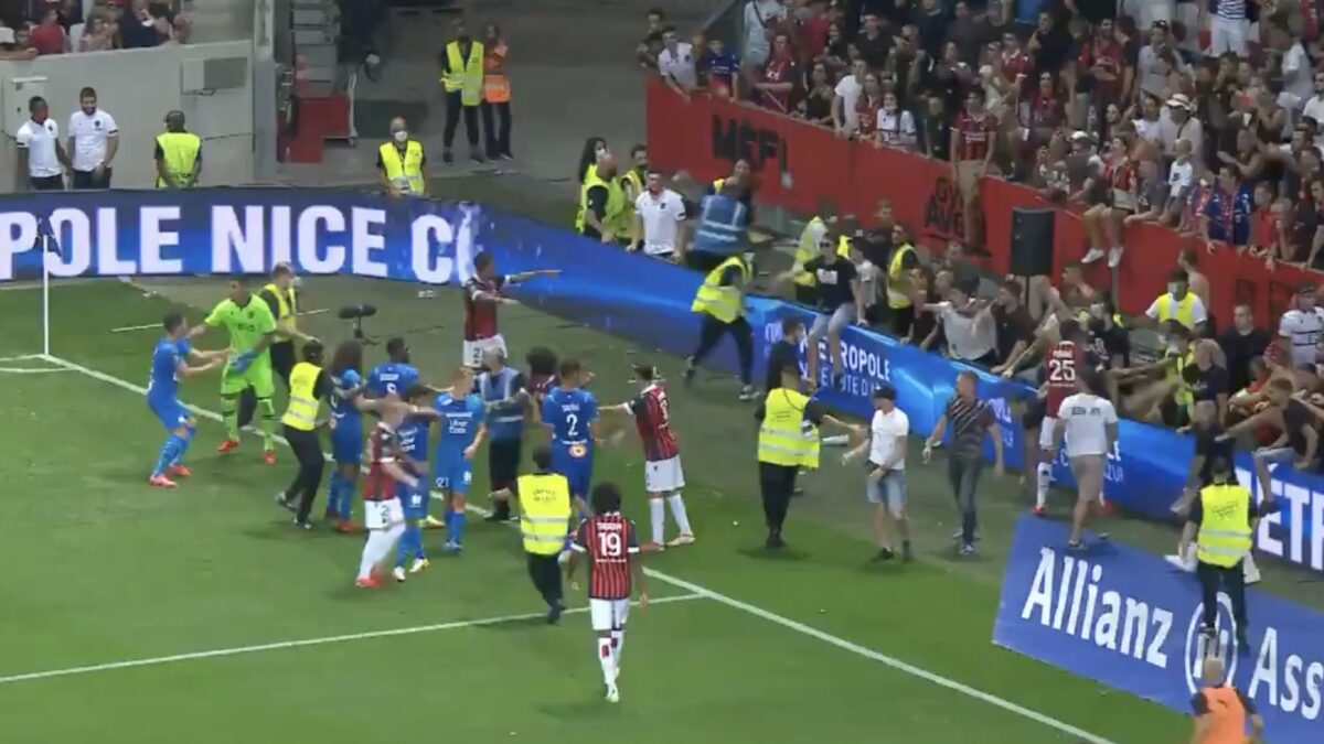 Het gaat helemaal mis aan de Franse zuidkust. Fans van Nice gaan het veld op en proberen te vechten met spelers van Marseille... De wedstrijd ligt voorlopig stil.#ZiggoSport #Ligue1 #OGCNOM pic.twitter.com/44kBOf6ebX