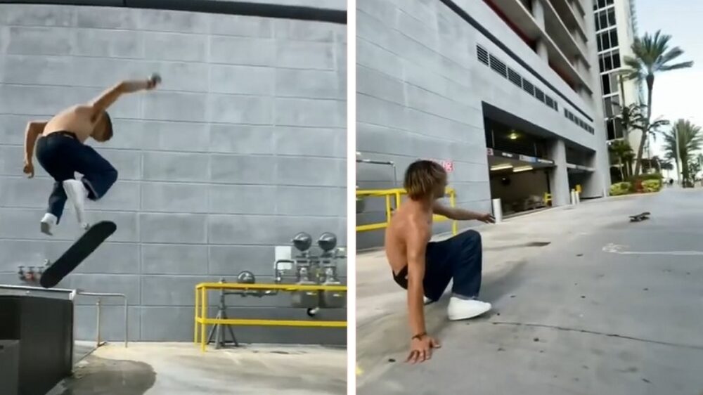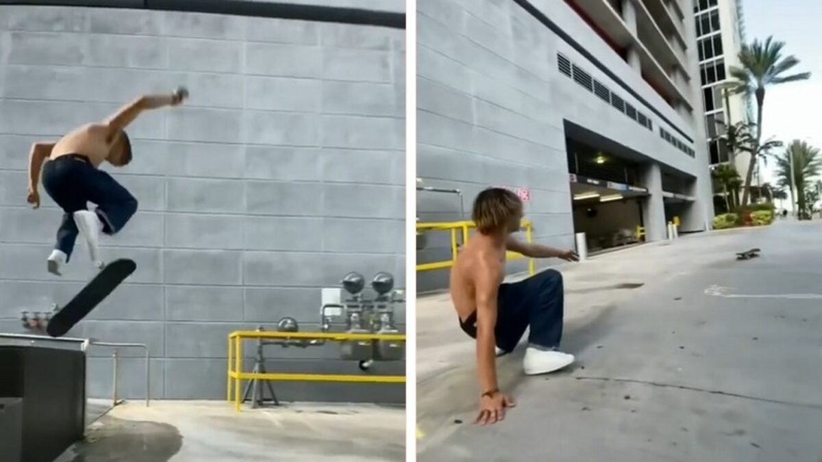 Je zou verwachten dat hij eerst nog een krantje kan lezen met een bakkie pleur erbij, maar voor deze motorbink kwam het skateboard echt uit het niets.