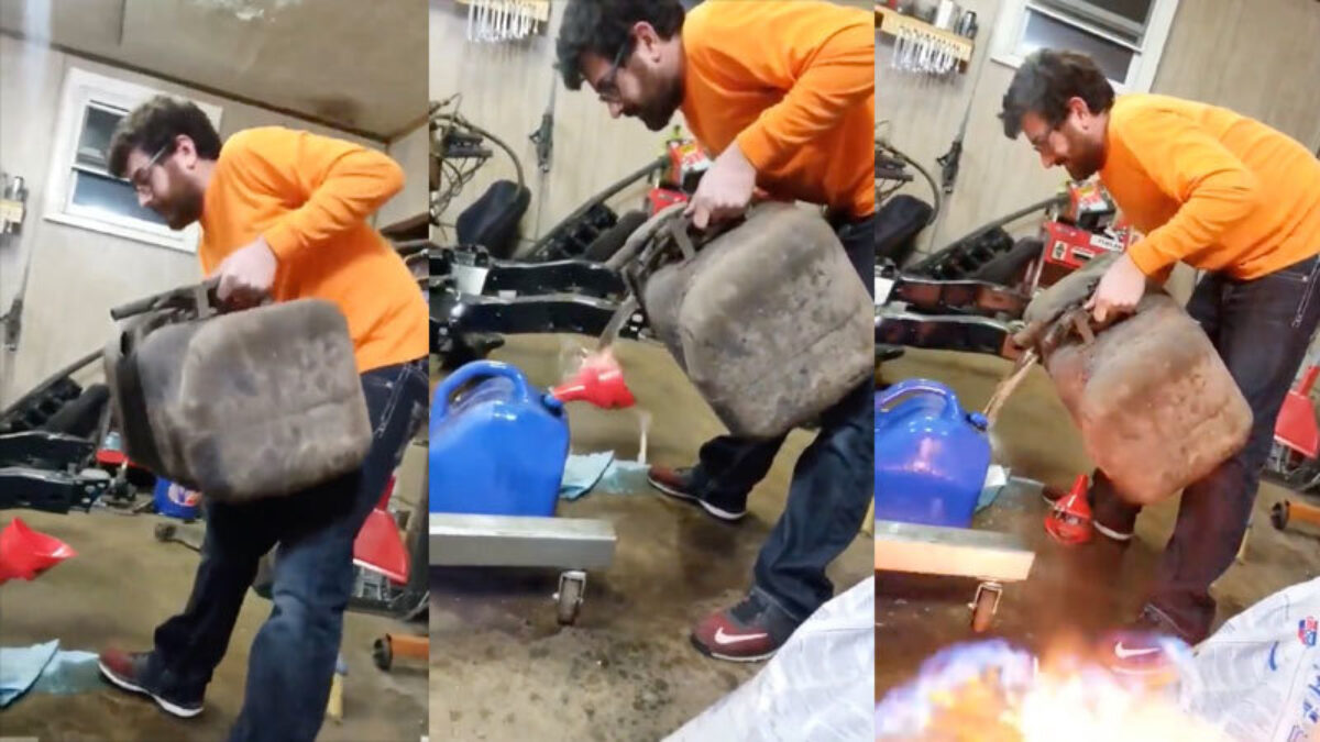 Een jerrycan met benzine vullen is nog knap lastig in je eentje Fails