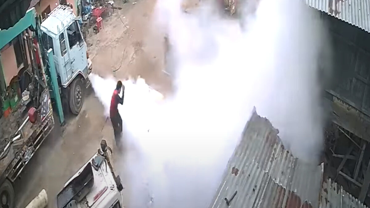 Klooien met gastanks? Niet doen, want doordat je het weet heb je een paar nieuwe gaten in je huis, zoals deze prutser in Thailand even demonstreert.
