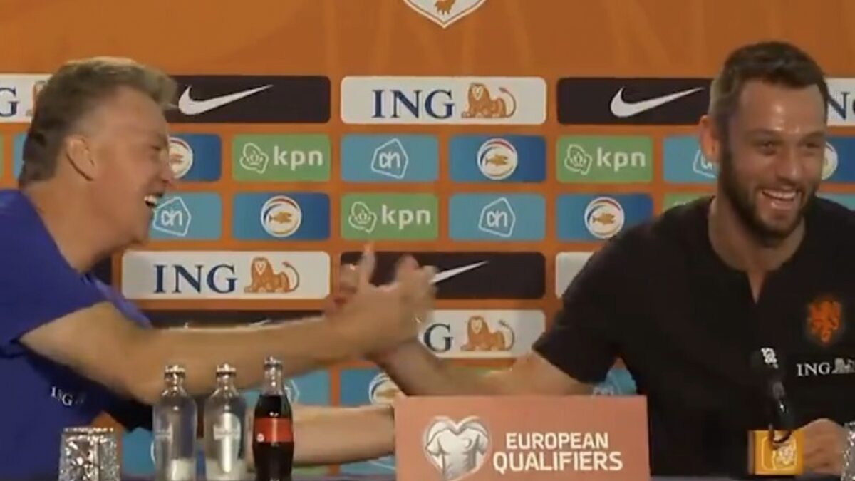 Dat de komst van Louis van Gaal als bondscoach ook zo zijn voordelen heeft qua entertainmentgehalte is inmiddels wel duidelijk. Gister was er in Zeist een persco en daarin werd Stefan de Vrij gevraagd, dit op dat moment naast van Gaal zat, of Louis al wat milder was geworden. Zijn antwoord was perfect, althans, dat vond Louis natuurlijk en dus pakte hij weer even een momentje... 🤣