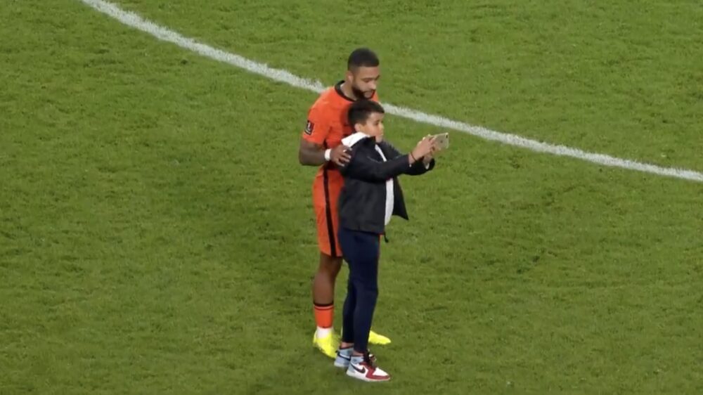 Baasje van de avond rent tijdens Nederland - Montenegro het veld op en maakt unieke selfie met Depay